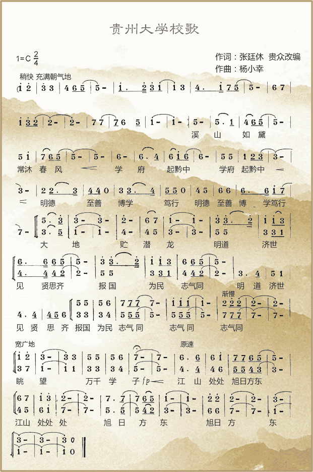 校歌淺釋: “溪山如黛,常沐春風,學府起黔中”,采用比興手法,既是取景,又是抒情,更是寫實。意謂黔中大地之上,遙望溪山美景,藍天白云之下,林木郁郁蔥蔥,溪水如碧玉織帶,一派生機,有如染上了薄薄的一層墨綠色,一座氣勢宏偉的現代型學府拔地而起,經歷了百余年的發展歷史,如今自然與人文相互襯映,人與萬物都沐浴在春風化雨之中,顯得更加地靈人杰,風物宜眼,前途無量。 “明德至善,博學篤行,大地貯潛龍”,均以用典的方法,點出了全校師生的理想追求以及今天人才濟濟的盛況。 “明德至善,博學篤行”為貴州大學校訓。“明德至善”,出自《大學》“大學之道,在明明德,在親民,在止于至善。”意思是大學的根本宗旨,首先在于透徹地了解和彰顯內在人性固有的道德光明,然后必須轉向社會民間作自立立人,即親近人民并竭盡全力為之服務,最后則要通過個人修身與社會實踐,使社會和人都臻于和詣圓滿的至善至美的理想境界。 “博學篤行”乃中國傳統儒家文化治學的根本方法,出自《中庸》“博學之,審問之,慎思之,明辨之,篤行之”。意思是必須廣博地學習,審慎地詢問,慎重地思索,明晰地辨析,篤實地履行,才能真正達到理想的學問境界和人生境界。前四句“學問思辨”,乃是致知的漸進升華過程;后一句“篤學之”,則指踏實的實踐功夫。 只有通過知與行兩個方面的不懈努力,才能在人生境界與學問知識上真正有所成就。歌詞舉二而涵蓋五,當視為“學問思辯行”的全面概括。 “大地貯潛龍”,“潛龍”典出《易經.乾》:“潛龍勿用”,意謂尚在黔省最高學府就學的莘莘學子,雖如潛龍一般專心向學, 有著無以限量的光明前途,必將在不久的將來對祖國對人民作出巨大的貢獻。如果說“潛龍”取意于“天行健,君子以自強不息”的精神,那么“大地”則既指黔中大地,又暗喻坤卦“地勢坤,君子以厚德載物”的精神。全句大意是:黔中大地的貴州大學,為國家民族培養儲備了無數的有用人才,他們像“潛龍”一樣,既有“自強不息”的精神,又有“厚德載物”的品質,必將在不遠的將來,為國家民族作出自己應有的貢獻。 第三段“明道濟世,見賢思齊,報國為民志氣同”。《論語.里仁》:“見賢思齊焉,見不肖而內自省也。” 意思是青年學子進德修業,要擔當道義,熱愛祖國,胸懷天下,救助社會,服務人群,在報國為民的共同理想感召下,同心同德,志存高遠。在學習過程中,看到比自己優秀的人,便要想著向他們看齊;看到缺點比自己多的人,便要時刻注意反省。全句大意是:要勇于追求人生的真諦,發揚光大真理(道),要做到見賢思齊,見不肖而內自省。 最后一段“眺望萬千學子,江山處處旭日方東”。意思是登上黔中大地高高聳立的山脈,極目遠眺,萬千群山逶迤綿延,有似群龍飛舞,宛如無數莘莘學子立地倚天,匯成天地般的磅礴氣勢,共同奔向無限美好的未來。而一輪紅日亦在此時從東方冉冉升起,照耀著祖國山河大地,無論人與自然,都顯得更加朝氣蓬勃,更加美麗嬌嬈。 |